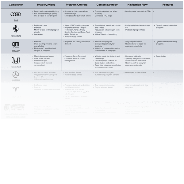 My first approach was to list all the competitors and map what they offered, what their highlights were, and how they portrayed the students. I then combined these data with the findings from User Interviews.
