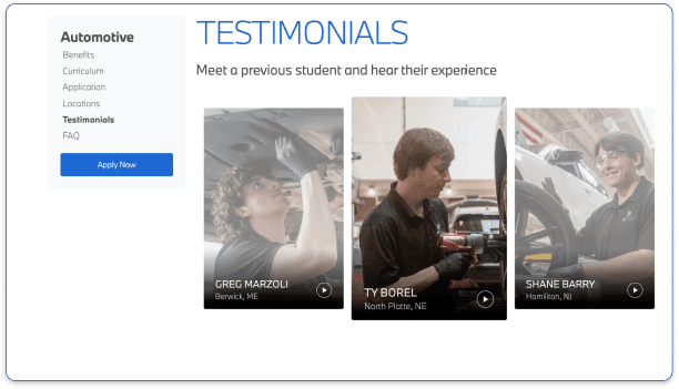 Program pages had a narrative, starting with a real student video testimonial