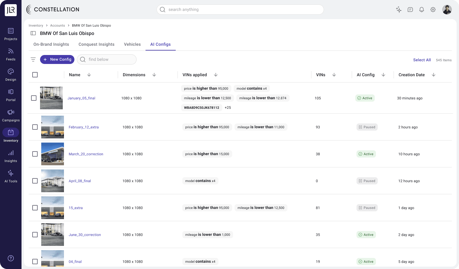 A centralized view of all configurations, their status, and the VIN segments they affect. Users can duplicate, customize, or remove configs as needed; promoting reuse while maintaining clarity and oversight. The gallery reinforces visibility and governance across the system.