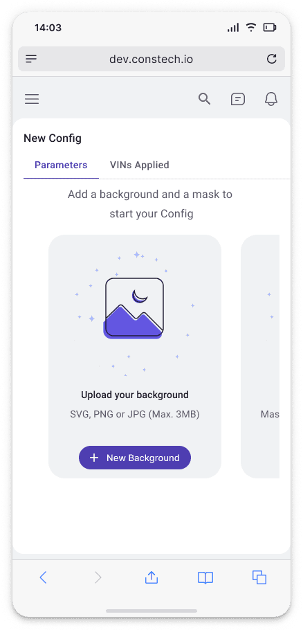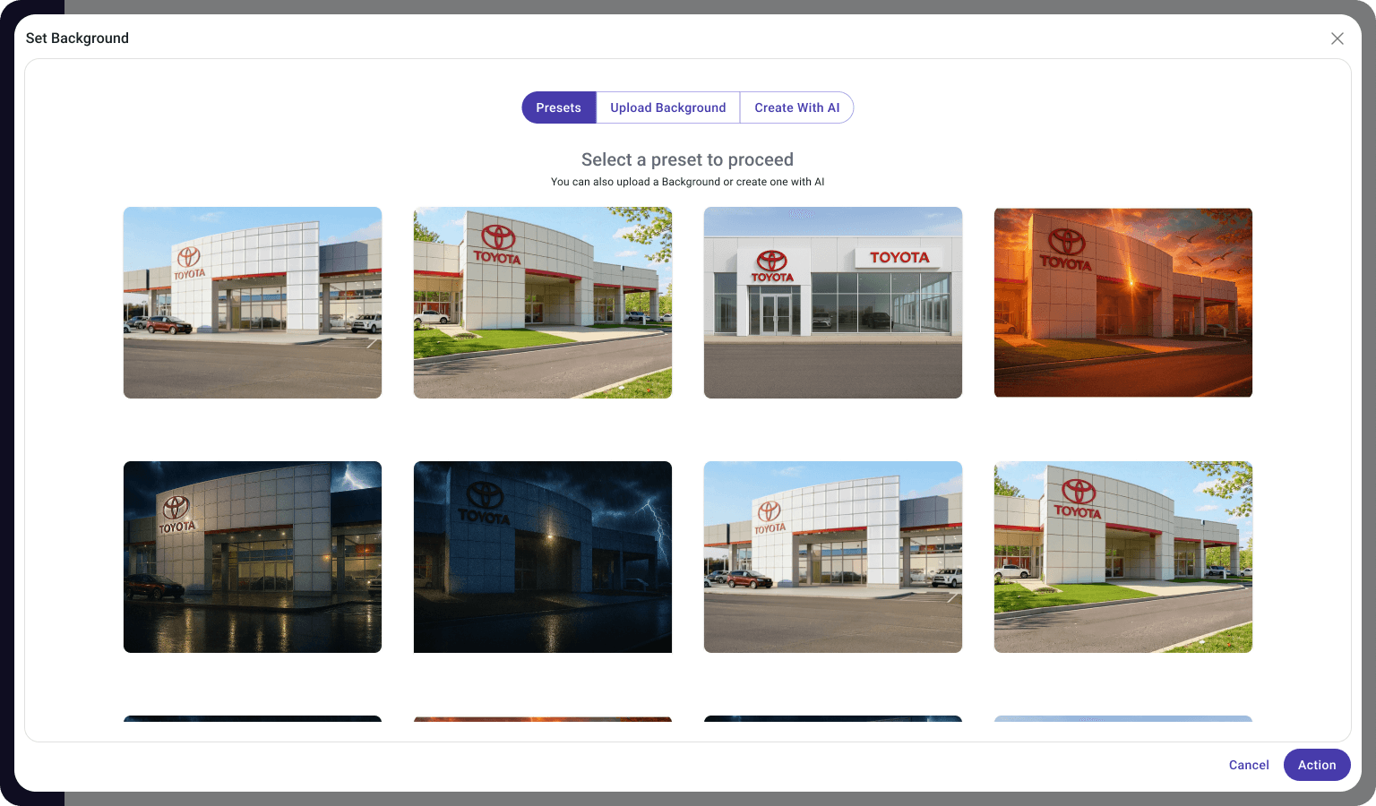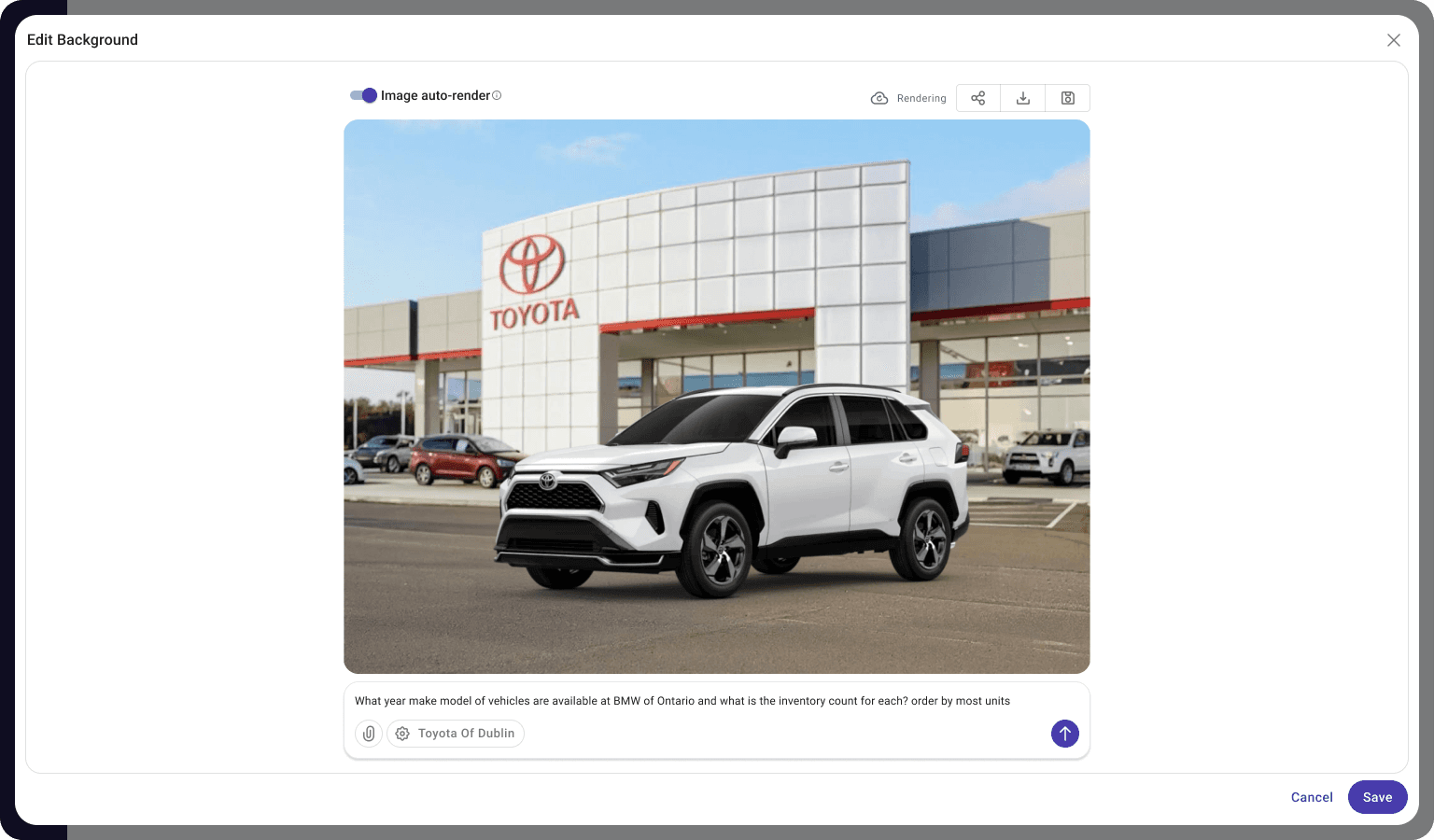 A dedicated workspace for composing the final vehicle image before rendering. Users can select from curated background presets, remix or generate new environments, and precisely position and scale the car in real time. The goal was to shorten the feedback loop and give users full visual control before committing to the final output.