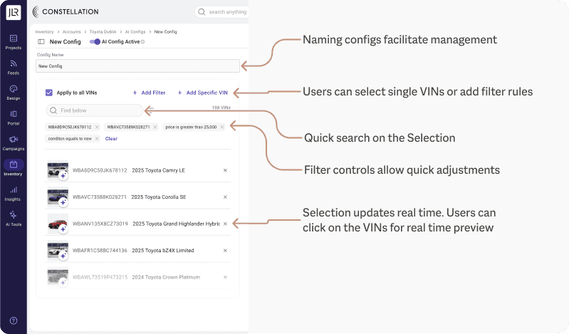Configurations can be clearly named and scoped to specific VINs using filters or manual selection. This ensures long-term manageability as inventory scales, while preventing unintended application across vehicles. Granular targeting transforms configurations from global settings into controlled, intentional actions.